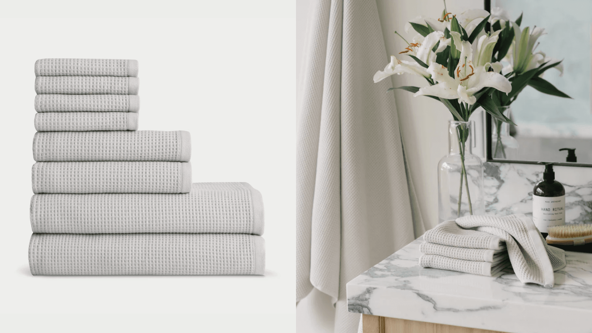 This waffle set, which includes four washcloths, two hand towels, and two bath towels, is made from a blend of cotton and bamboo viscose. While the modern waffle design might not look super soft, the inside of these towels is gentle, ribbed terry that feels great on the skin. Plus, the brand says they get softer with every wash.