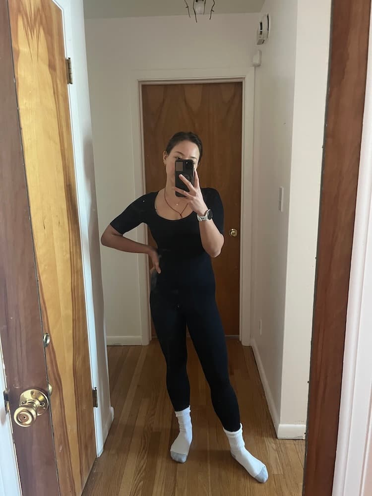 Getting into the onesie requires dedication, especially that first time. I followed the recommendation to size down, and although it wasn’t as tight as shapewear, I still performed an interpretive dance just to shimmy it on. Once it was on, the effort felt worth it, but the process was still tedious.
