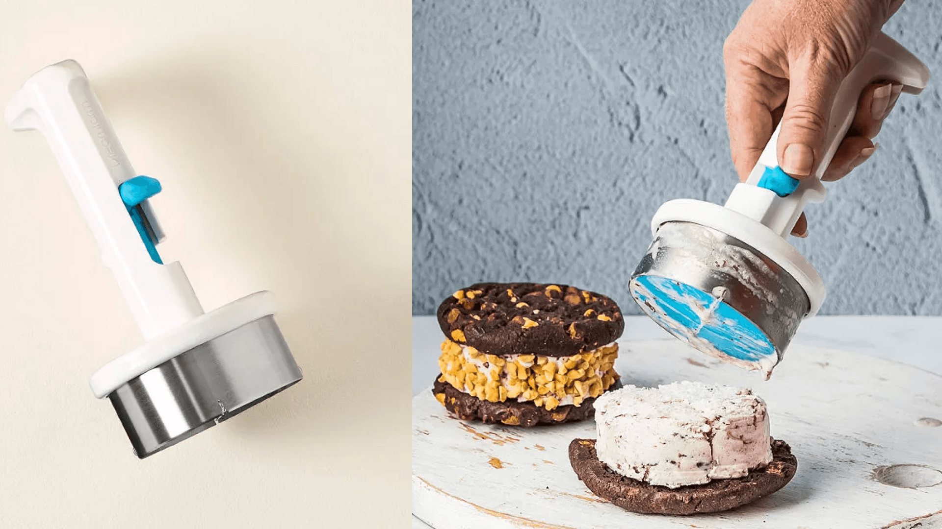 This tool deposits the perfect cylinder to fit between cookies, brownies or whatever ya want your sandwich to be. Just push, twist, and eject. It’ll serve about a half-cup portion of ice cream and is dishwasher safe. Presto. ($20, Uncommon Goods)