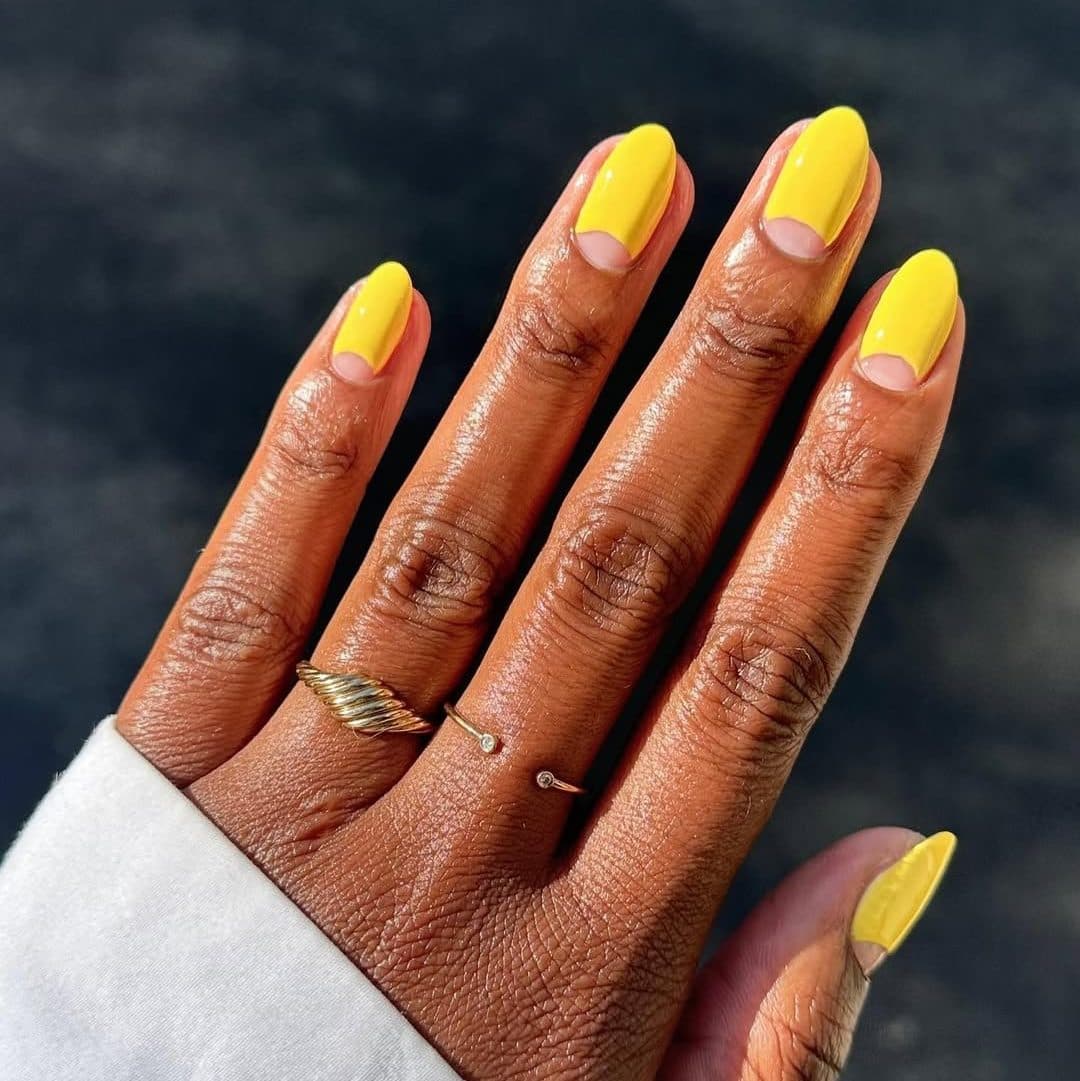 A half-moon design is an easy way to switch up your usual traditional manicure. Pair with a fun hue like this banana yellow for an extra punch.