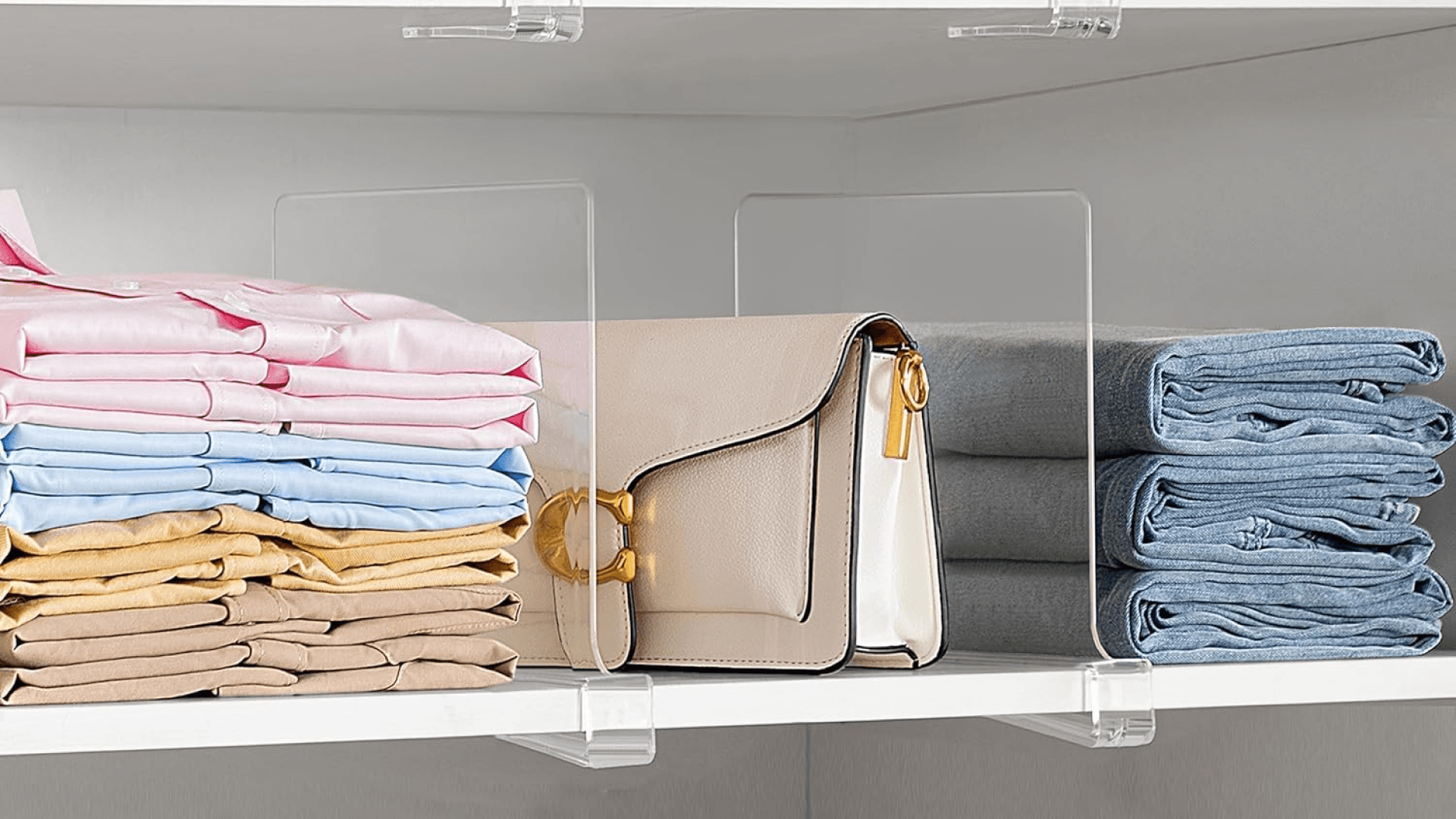 Clear shelf dividers for managing toppling piles…