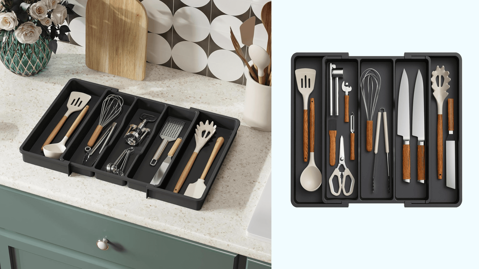 One of my least favorite things to deal with is a stuck drawer with too many utensils. These expandable drawer organizers have slots for larger utensils to ensure everything stays flat. They can be adjusted up to five slots at a little over 22 inches wide, but they also work with flatware. ({{dynamicPrice}}, Amazon)