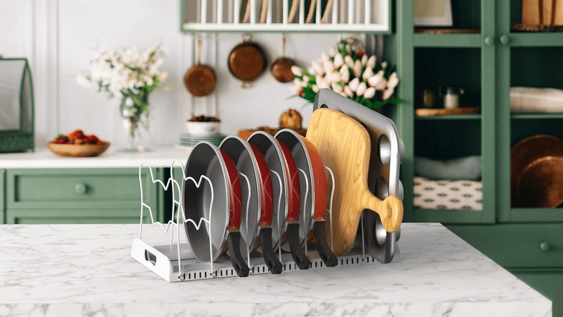 Forget having to play a game of Tetris to stack and store your pans. This adjustable organizer has 10 compartments for pots, sheet pans, and lids. It fits up to 22 inches in width and doesn’t require any assembly. ({{dynamicPrice}}, Amazon)
