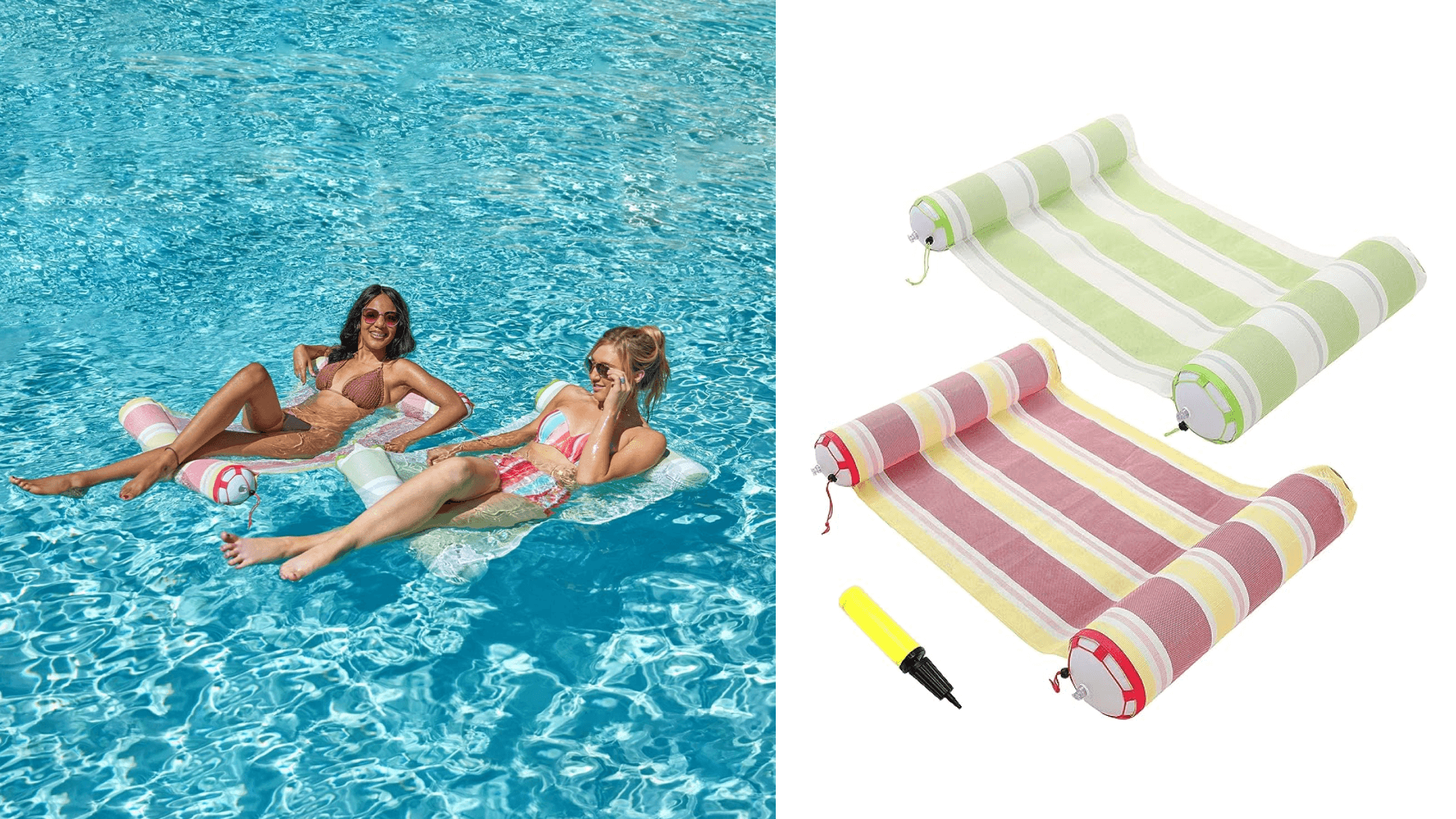 This one can keep you afloat four ways — lounging, sitting, drifting, or bobbing. It has a mesh center with two inflatable pillows at either end. Fill it up with the included air pump for pool time or lie down on the mesh shell and enjoy the sun. ($25.99/2 pack, Amazon)