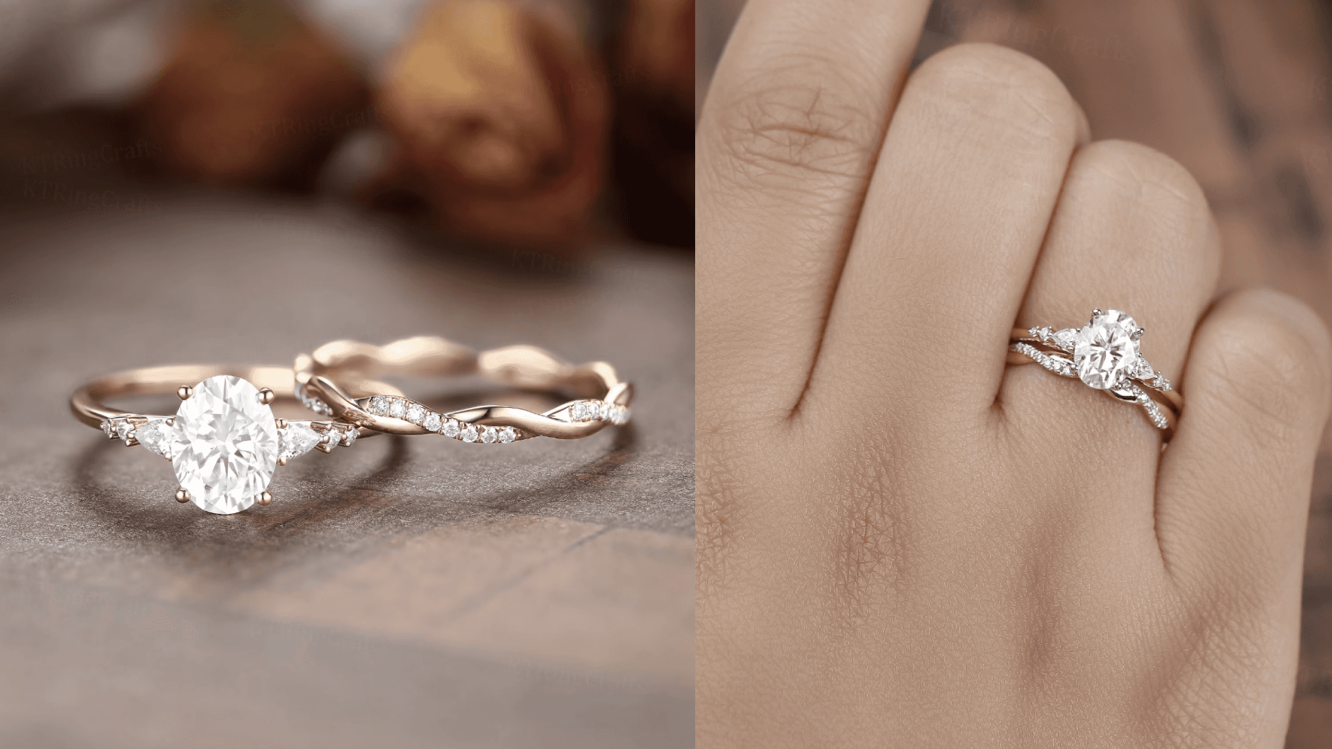 ICYMI, moissanite is a naturally occurring mineral but is typically lab-grown so that it’s large enough to be made into jewelry. If you’re on the hunt for affordable engagement rings, this is a solid one to consider. It's oval cut with a rose gold band and you can opt for other customizable options like the bridal set, which includes a matching wedding band that’s also covered in moissanite. ($516.09+, KTRingCrafts via Etsy)