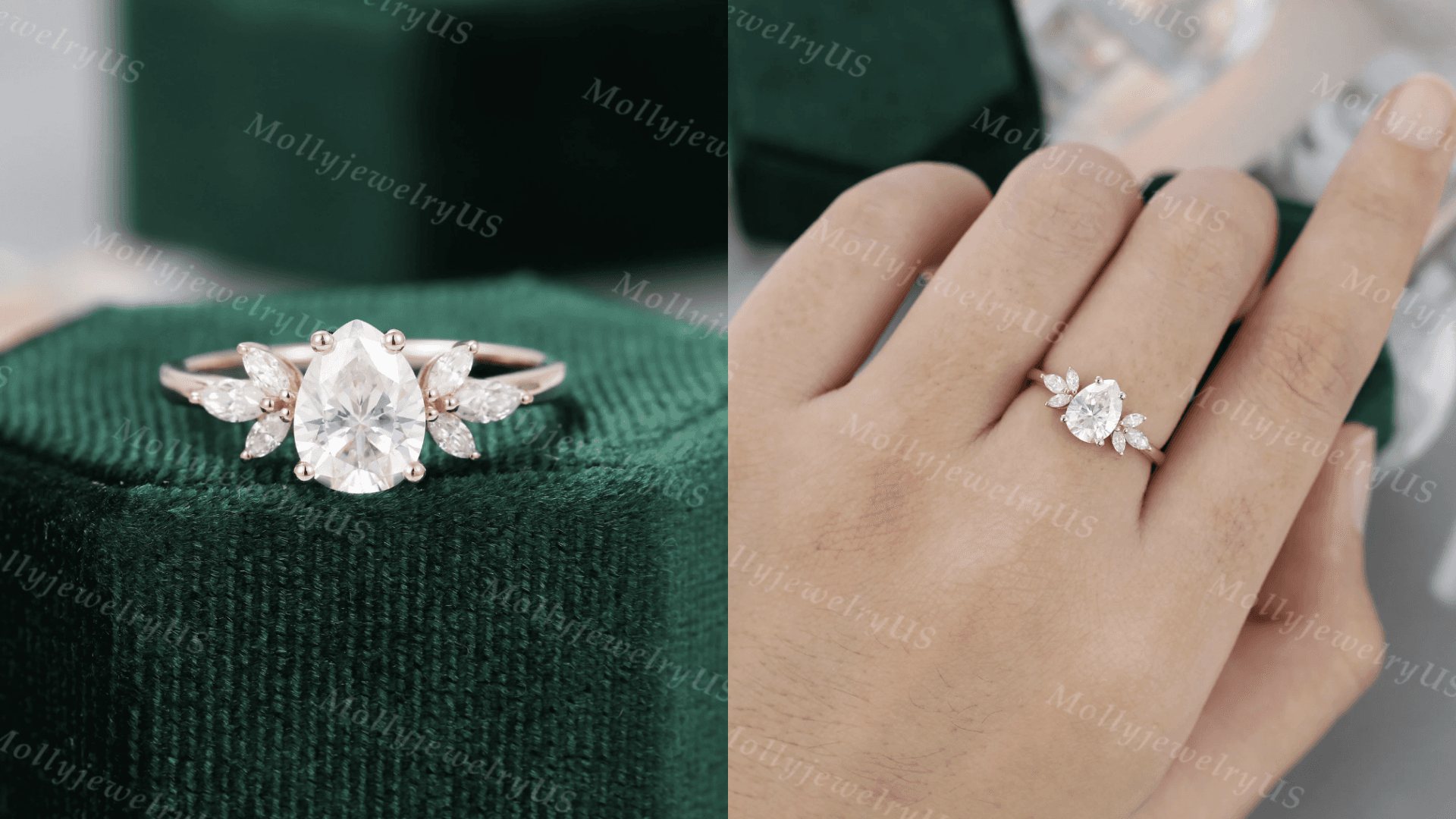 You can’t go wrong with pear-shaped moissanite framed in stone flourishes. You can pick whether you want the framing stones to be moissanite or diamonds and whether you want traditional 14-karat or 18-karat gold options. Consider this the perfect way to say ‘I love you pear-y much.’ ($469.20+, MollyjewelryUS via Etsy)
