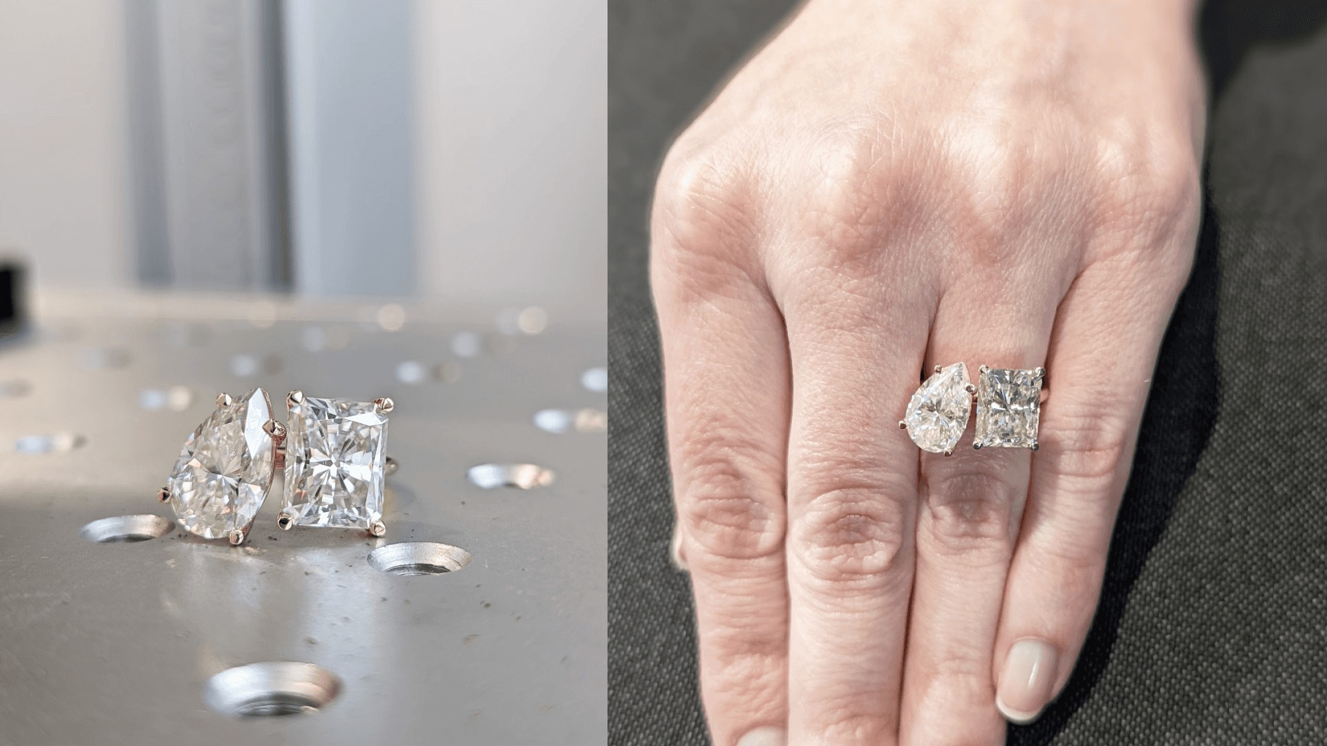 Why have one stone when you can have two? This moissanite engagement ring has one pear-shaped stone and one radiant-shaped stone on a dainty band. EmRata approved. ($972.23+, BravermanOren via Etsy)