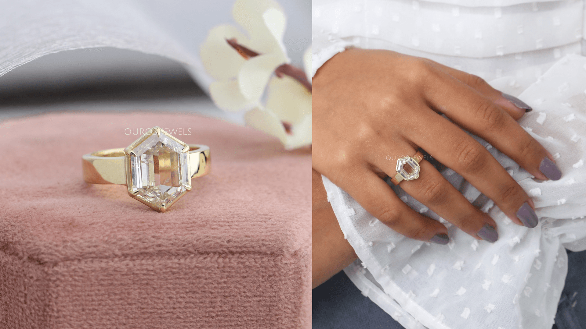 Hexagonal stones? So cool. From the unique shape to the chunky band, this engagement ring will make a statement. It comes in 10-, 14-, or 18-karat yellow gold, rose gold, and white gold. And if that's not your metal of choice, it also comes in platinum. Win. ($1,854+, OurosJewels via Etsy)