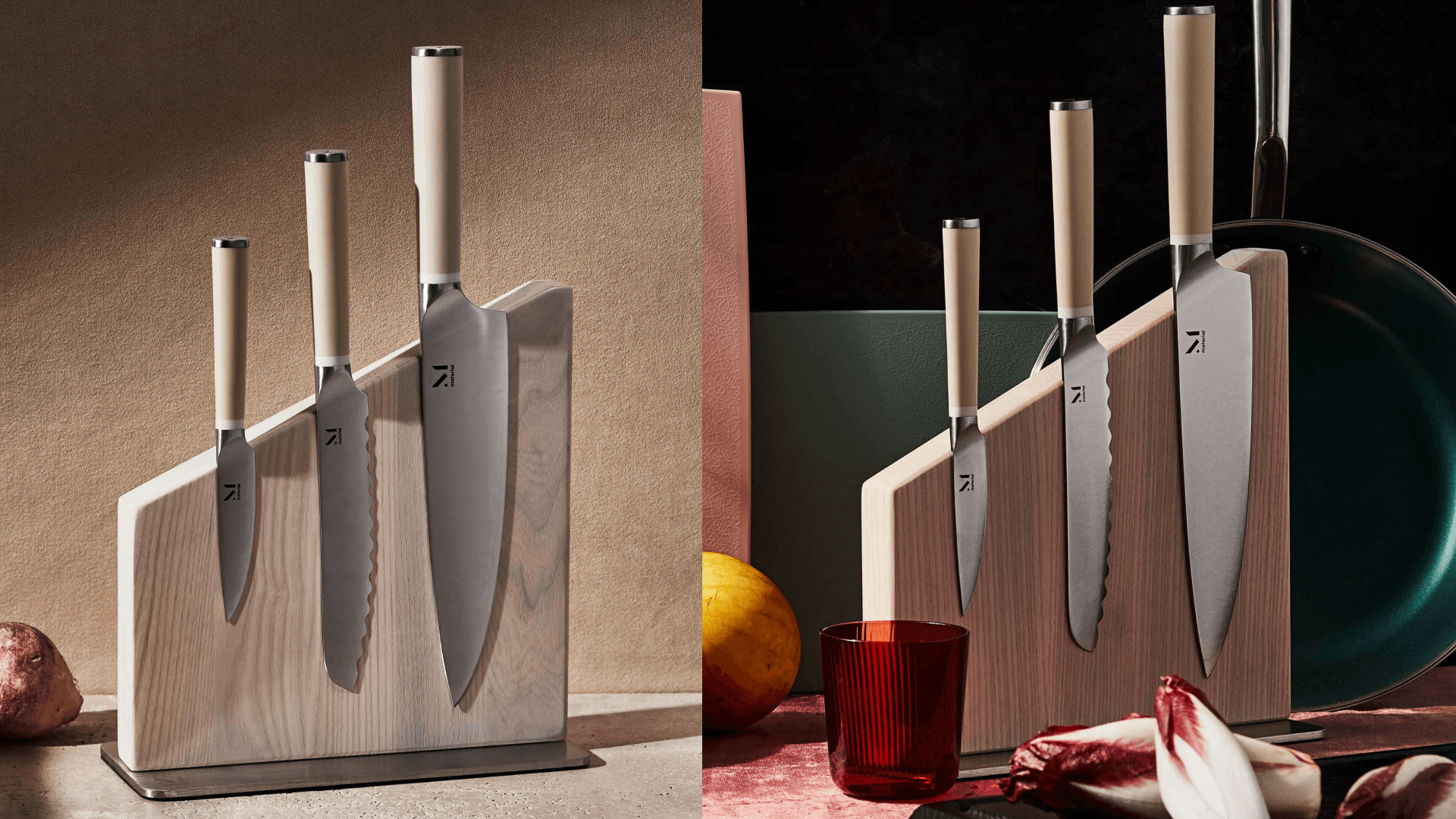 We’re convinced these knives improved our chopping skills. The handles are slightly weighted for a controlled grip and the magnetic stand looks sleek on our countertops. They’re made of Japanese stainless steel and high carbon for long-lasting, quality cuts. This is a pricey investment that’s actually worth it.