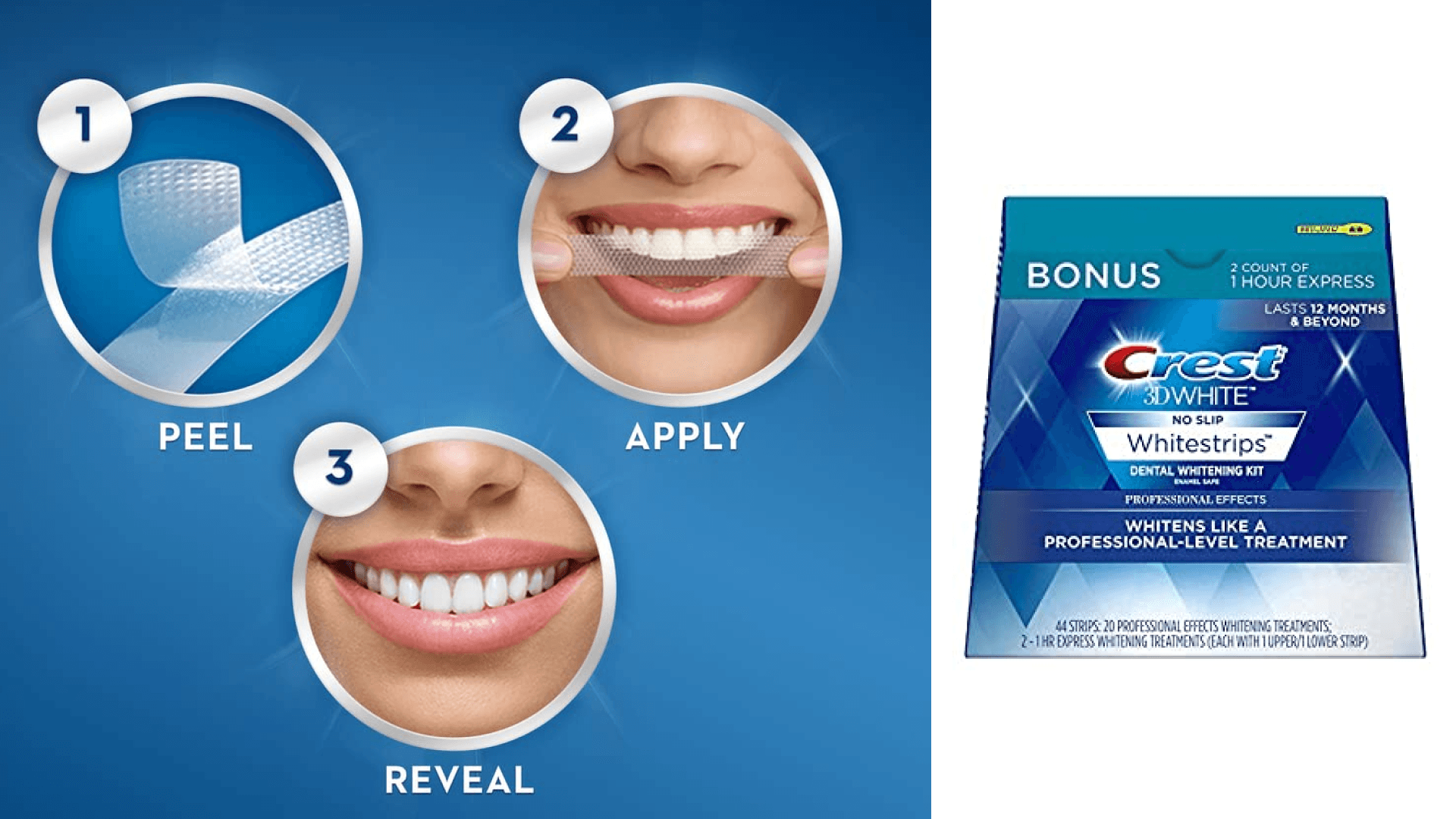Crest strips for the win. These non-slip, professional-level, flavorless strips are enamel safe — and can last for 12 months. Just lay them on your teeth for 30 minutes (you’ll get ones for your upper and lower babes), and you’ll be on your merry way to having the pearliest whites. They have over 60K reviews and come recommended by dentists, in part, because of the hydrogen peroxide in them. That’s the same ingredient you’d find in a professional whitener at a dentist’s office — just at a lower percentage. Before-and-after pics, coming right up. ({{dynamicPrice}}, Amazon)