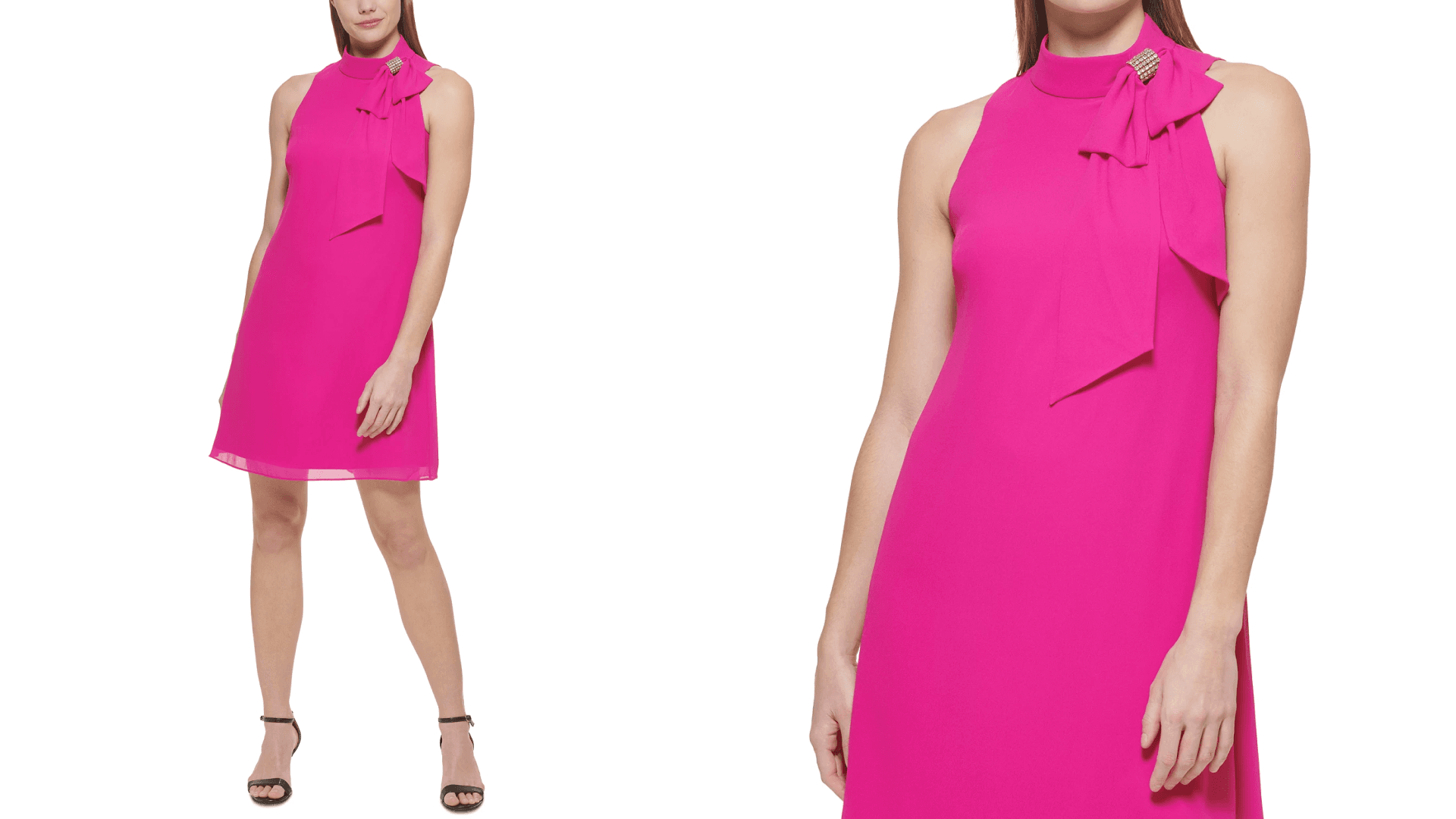 This hot-pink number is perfect for your next summer party. It’s sleeveless with an embellished chiffon bow to complete the high-neck look. It fits close to the body at the bust, but then flows out, hitting just above the knee. It’s a great way to play with color while keeping the style of the dress relatively modest. PS: Check out all our fave dresses for wedding season here. ($148, Macy’s)