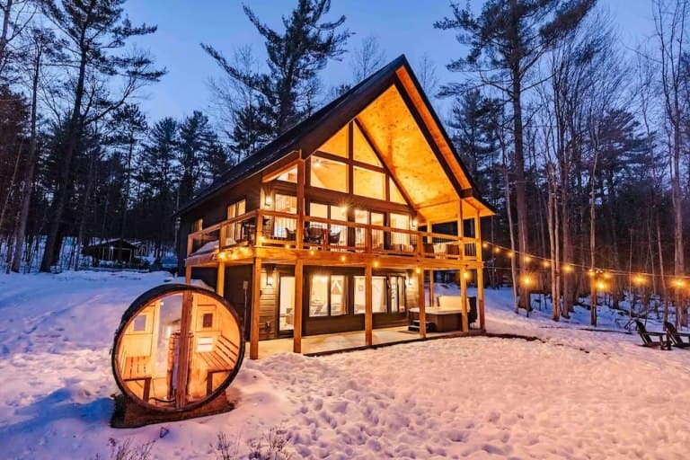 For a mountain escape with plenty of creature comforts, the Black Pine Lodge in the Adirondacks is a dreamy retreat. This modern A-frame cabin features 3 bedrooms, 3 baths, and luxe amenities like a hot tub, panoramic barrel sauna, and pool table, making it perfect for a couples getaway. Situated in the High Peaks region, you’ll have access to nearby hiking, kayaking, and charming towns like Wilmington and Lake Placid. End your day relaxing on the deck by the gas fireplace or stargazing by the outdoor fire pit in total tranquility.